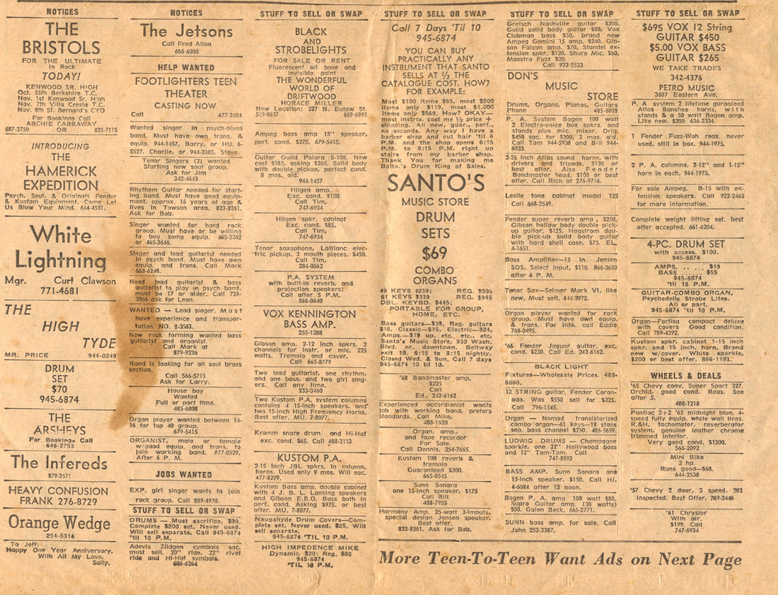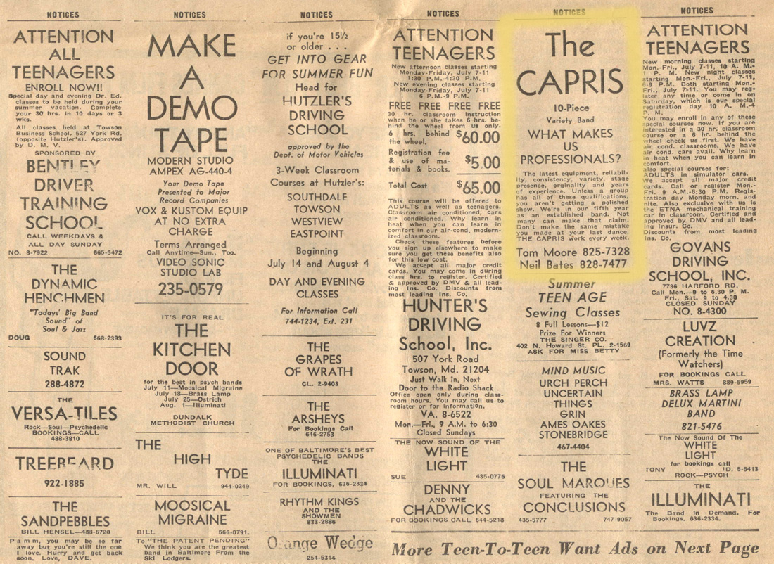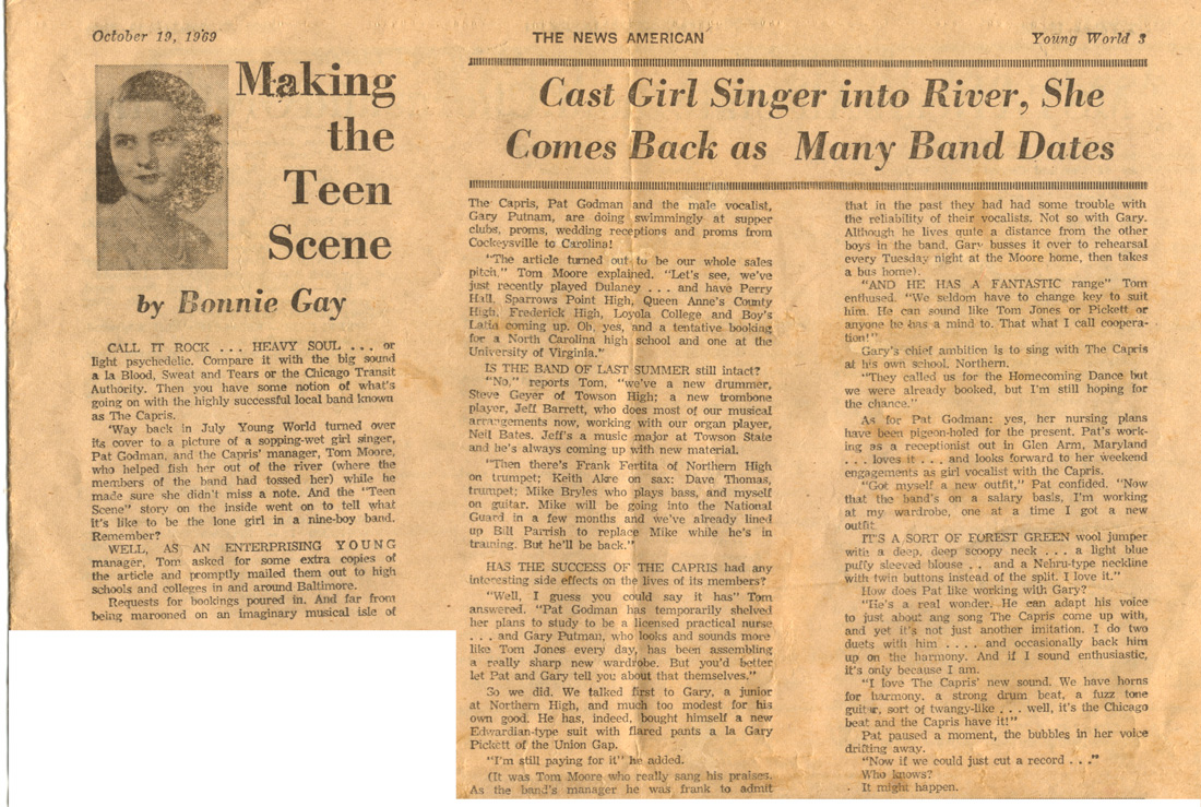 CaprisThanks to Neil Bates for these great News American clips from 1969 featuring the Capris, and a glimpse at a lost world of teen-to-teen advertising. Capris Lead Singers Gary Putman and Pat Godman Young World article