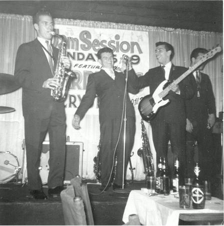 L. to R.: Joe Adams-sax, Al Hoffman-vocal, Frank Adams-bass, Al Rossi-sax (behind bass). Group members not pictured: Joe Pente-keys, Artie Kay-drums
