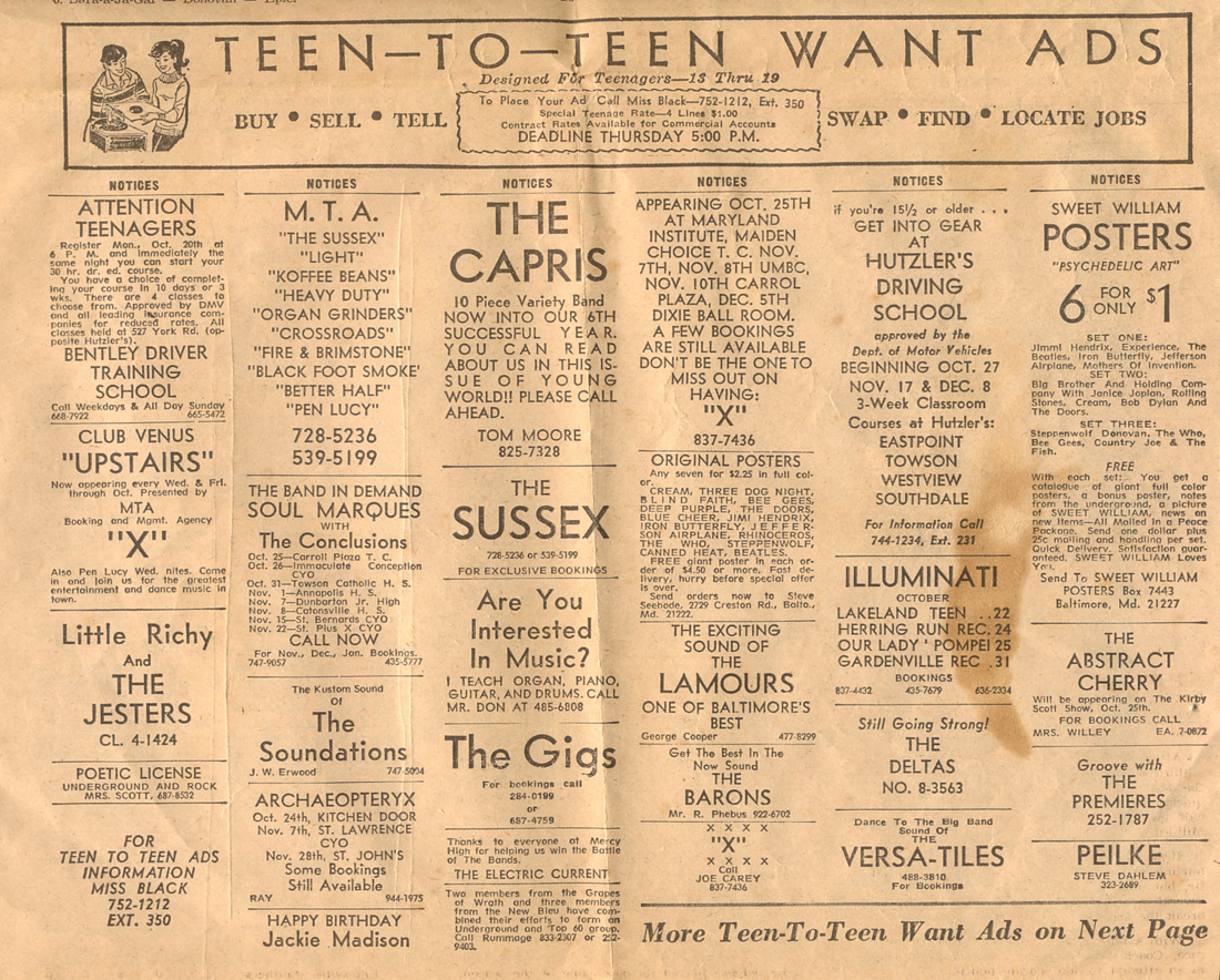 CaprisThanks to Neil Bates for these great News American clips from 1969 featuring the Capris, and a glimpse at a lost world of teen-to-teen advertising. Capris Lead Singers Gary Putman and Pat Godman Young World article