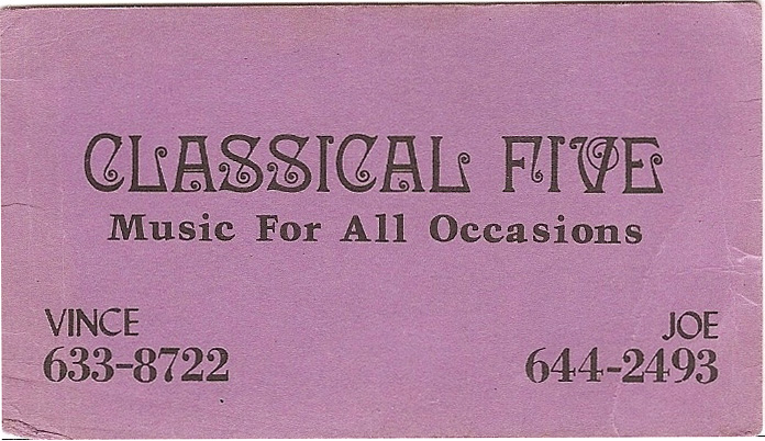 Classical Five— from Anthony T. Benvenga, January 2013 The Classical Five formed from members of Penelope. The members of that group were, Rudy D'antoni, Joe and Vince Sanzone, John Drexler, and Ernie Troia, and me — I was the roadie/sound man. Ernie Troia passed away about 11/12 years ago. |