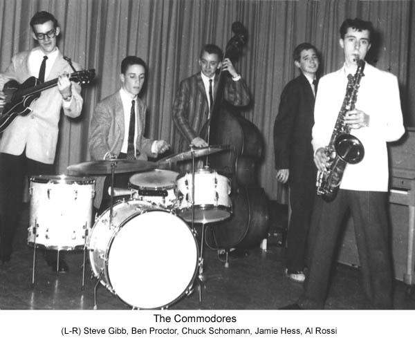 The CommodoresThe Commodores were formed at Towson High School in 1958 by Steve Gibb (guitar, '57), Ben Proctor (drums, '59), Chuck Schomann (bass, '60), Jamie Hess (piano), '59), and Al Rossi (sax, '58). It is said (in a totally unsubstantiated story) that the Admirals chose their name because an Admiral outranked a Commodore. The Commodores, 1958. |