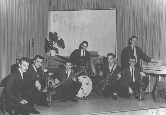 From left to right: Earl French-lead singer, John Zacha-tenor, Elwood (Woody) Schneider-bass, Gary Rusinovich-drums, Roland Gannon-guitar, Ed Hall-tenor, Danny Fitez-piano.